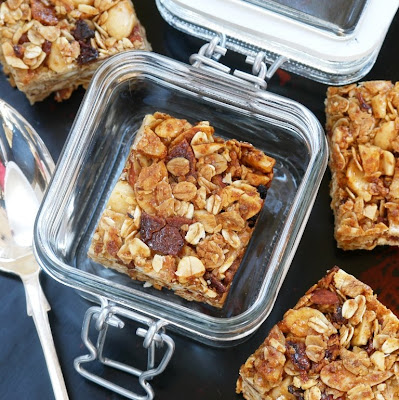 Once the oat mixture is done, remove it from the oven and reduce the heat to 300 degrees F. Immediately add the oat mixture to the liquid mixture, add the dried fruit, and stir to combine. Turn mixture out into the prepared baking dish and press down(i took this step seriously and pressed down really good and hard, evenly distributing the mixture in the dish and place in the oven to bake for 25 minutes.(i left mine in untill the edges were starting to brown and the top was golden) Remove from the oven(i pressed down slightly again) and allow to cool completely. Cut into squares and store in an airtight container for up to a week.
