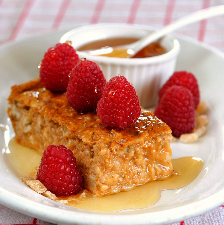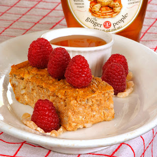 it's great hot or cold...or what i like to do is bake it on a Sunday and refrigerate over night. it will cut into nice squares for easy reheating through the week. serve with some maple syrup OR better yet...have you met the GINGER PEOPLE?...the ginger syrup is fabulous!...everything the ginger people make is fabulous. the ginger syrup, some fresh berries and a little Greek vanilla yogurt is my kinda "power-up breakfast"...YUM...it's gonna be a great day!