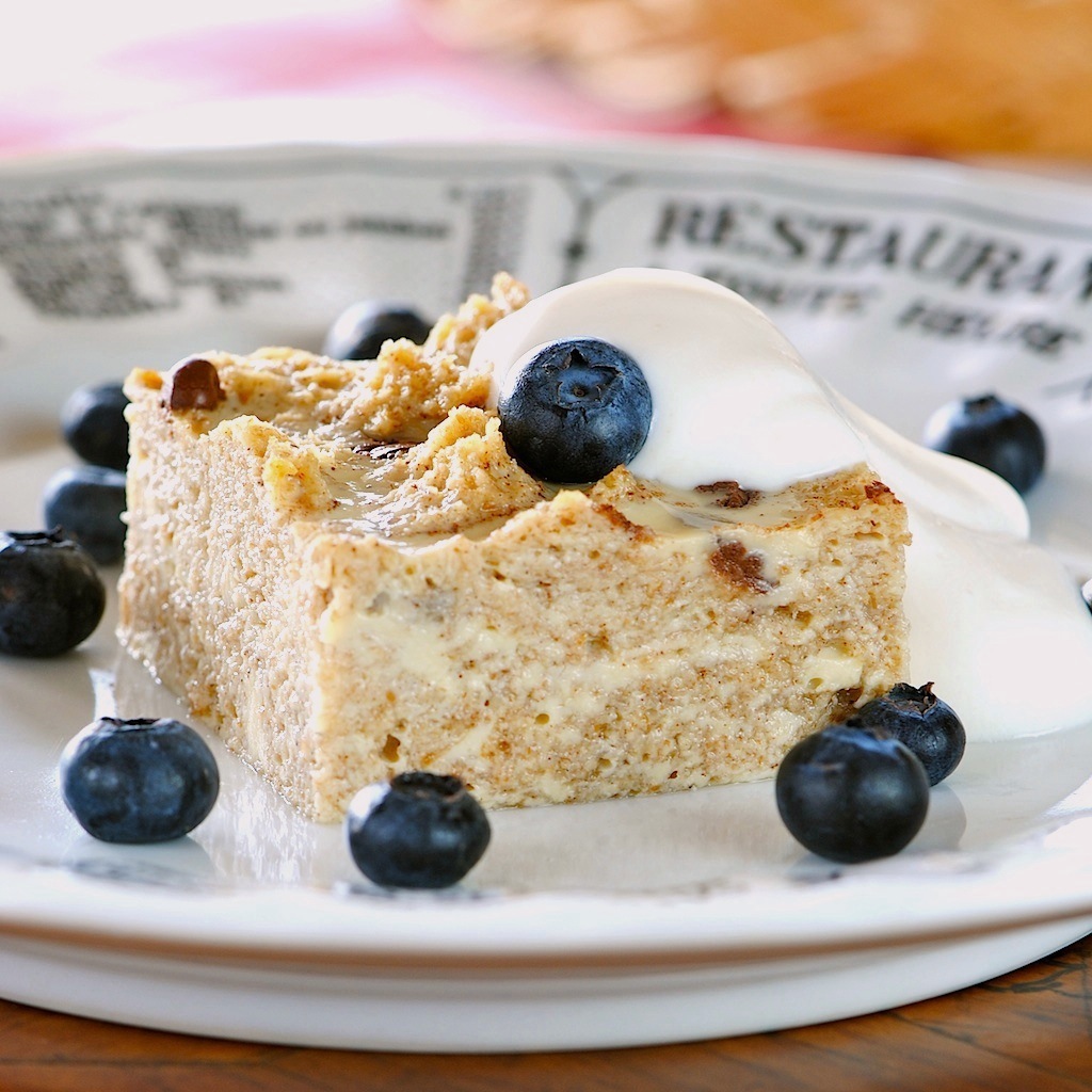 straight out of the oven, it's soft and custardy. add a few extra mini chips or shave some dark chocolate on before serving to make it look like more of a dessert. on it's own it's fabulous, but you could dress it up a bit... top with lite whipped cream, a slight drizzle of chocolate syrup or sugar free maple syrup...add some toasted almonds or pecans for a little texture?...fresh berries and some creme anglais...?